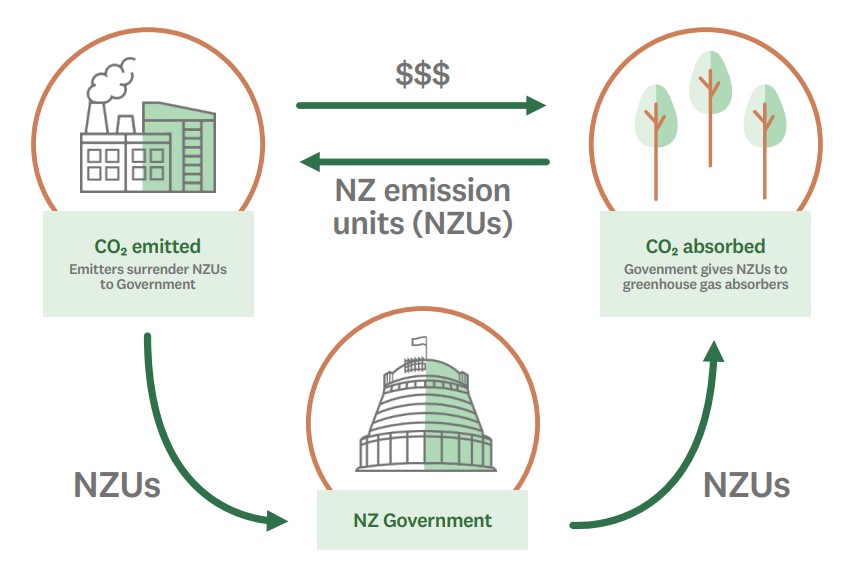 The ETS puts a price on greenhouse gas emissions, creating a financial incentive for businesses to reduce their emissions and landowners to earn money by planting forests that absorb carbon dioxide as the trees grow.
