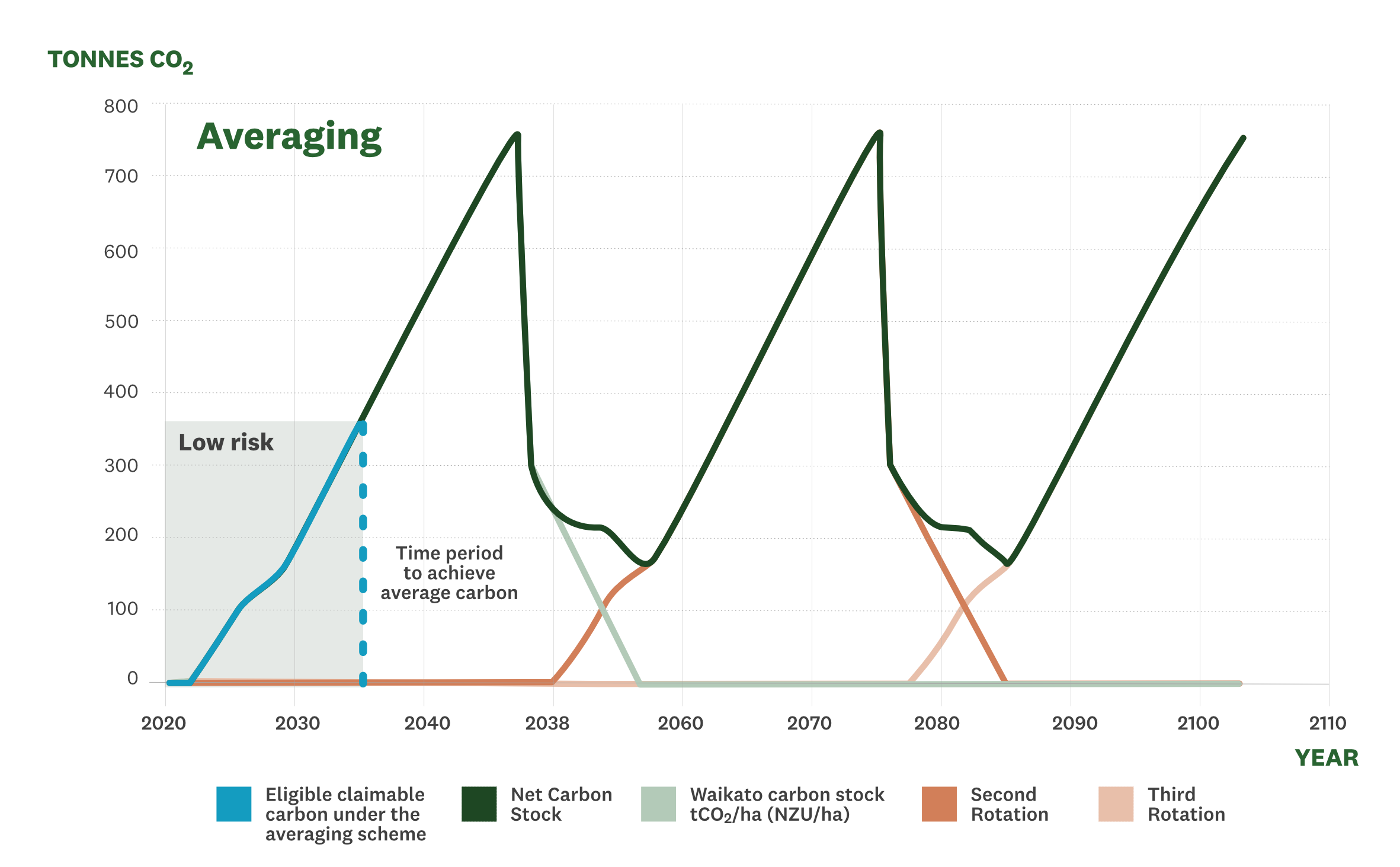 Instead of accounting for the actual increases and decreases in carbon, participants now account for the long-term average amount of carbon stored in the forest. This is illustrated by the shaded areas in the figure below.