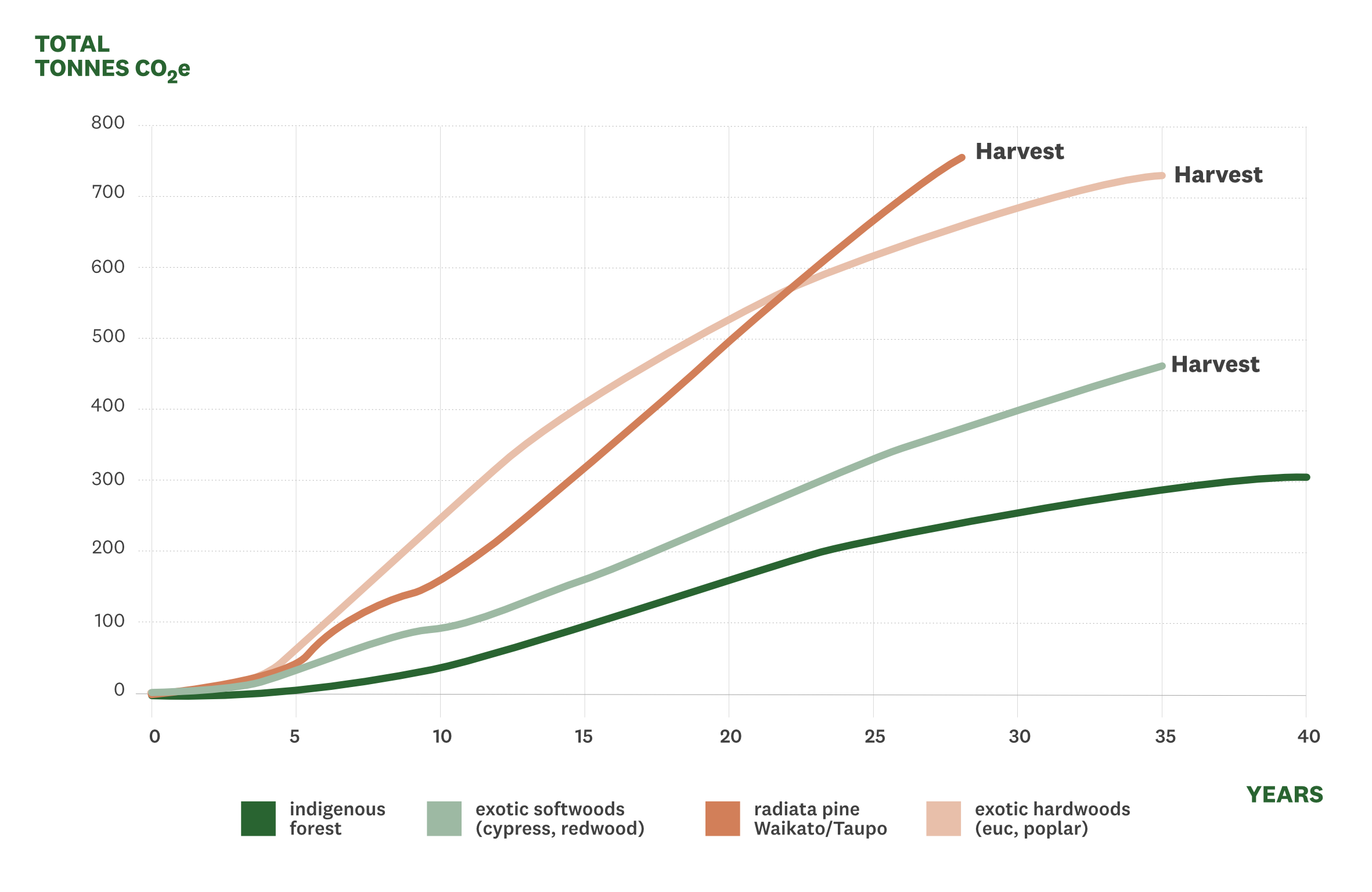 Different species sequester carbon at different rates, as shown in the figure below. The Ministry for Primary Industries issues standardised 'look-up' tables to assess carbon sequestration. ETS participants that have less than 100 hectares of registered ETS forest must use these tables to work out the carbon stored in their forest. ETS participants with 100 hectares or more must physically measure the carbon stock in their forest.