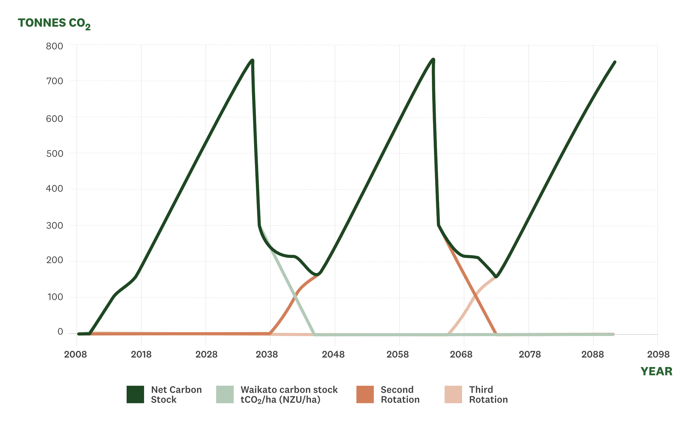 If the forest is replanted, the new growth from the second rotation will overtake the decay from the previous rotation and the forest will begin earning credits again. This is usually about 8-10 years after harvest.