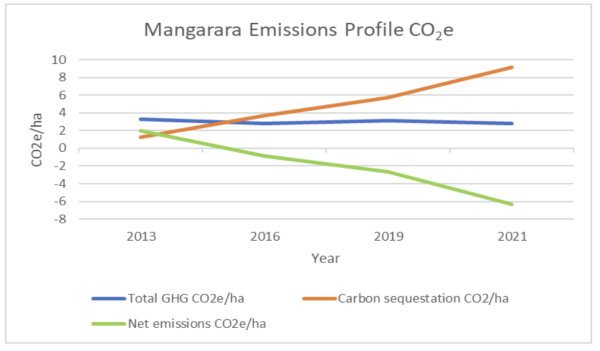 Mangarara will reach carbon zero status in 2025, with a long-term goal of sequestering five times more carbon than the farm emits.