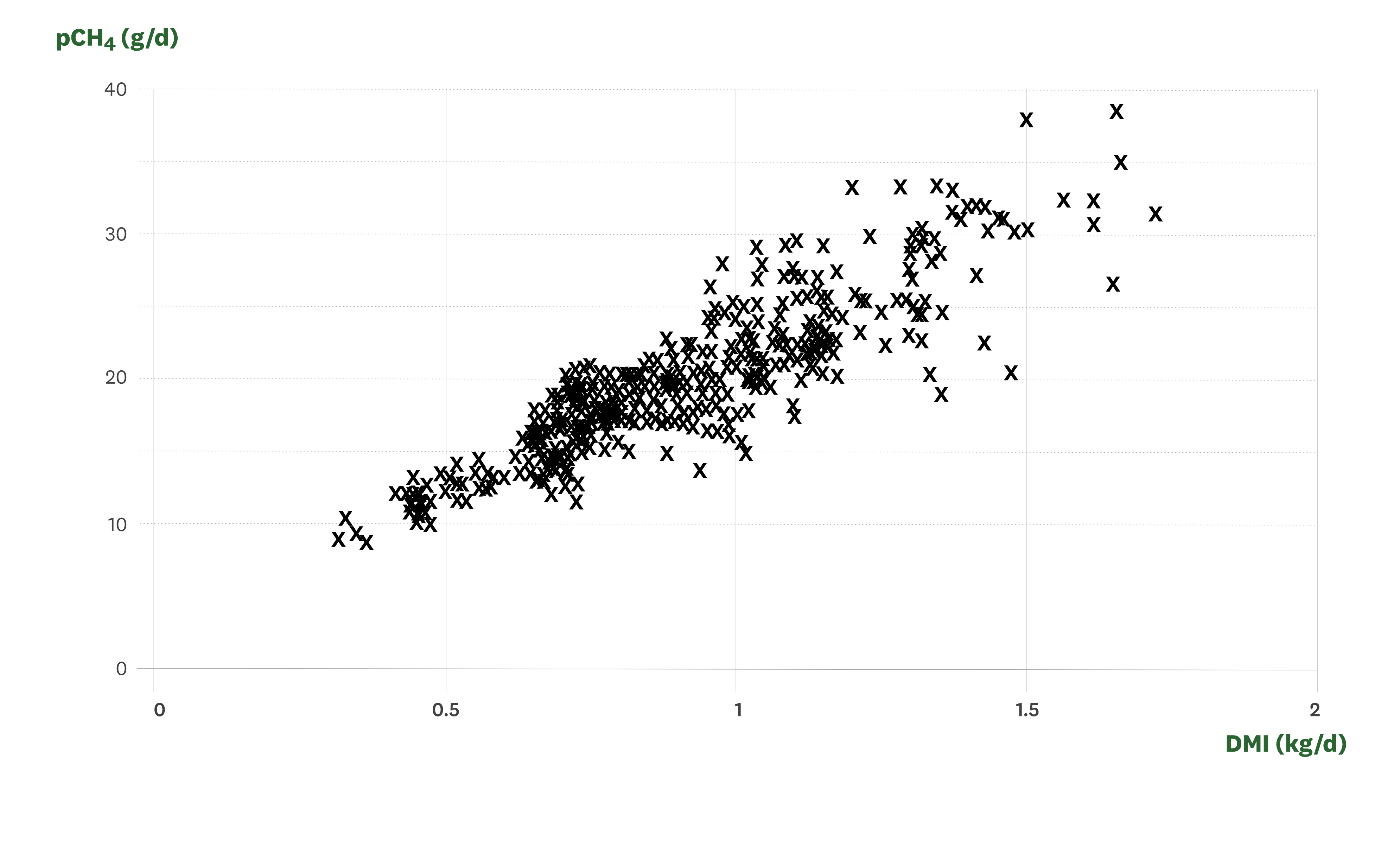 The amount of methane produced by an individual ruminant animal is directly linked to how much it eats, as shown in the graph below: